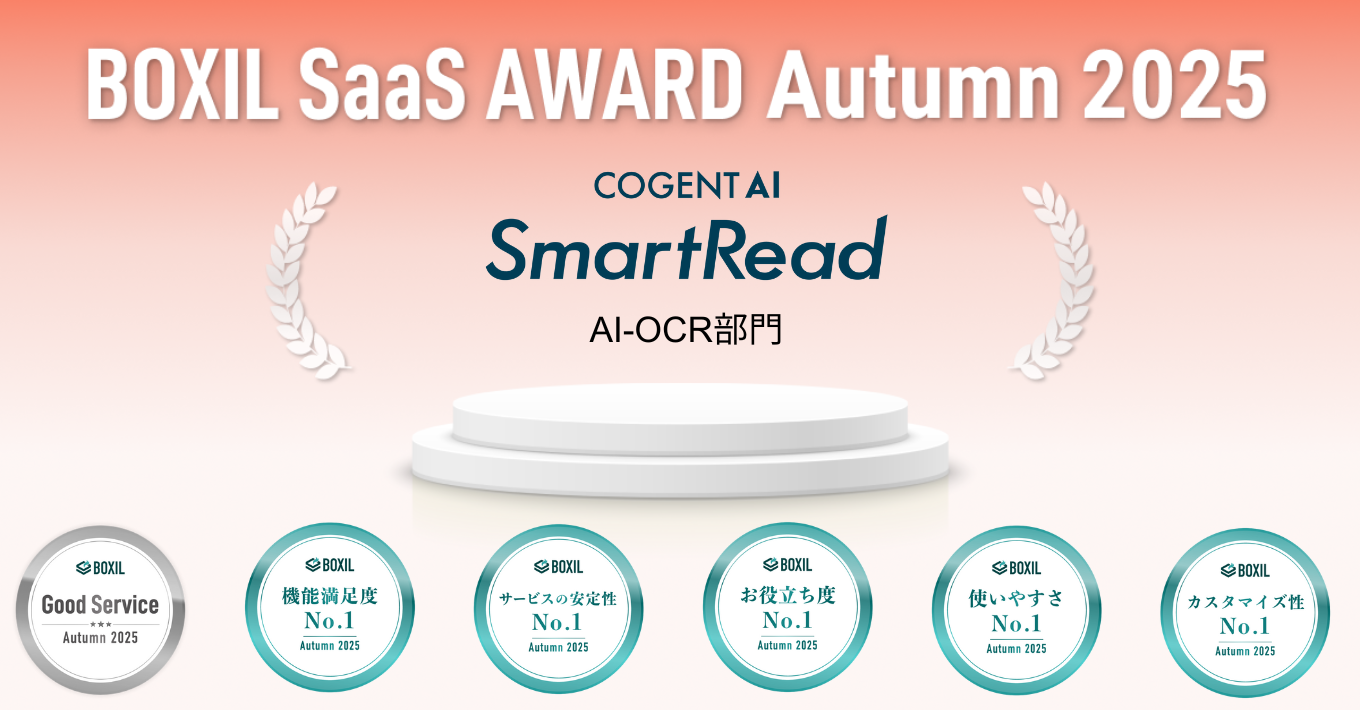 株式会社Cogent Labsが提供する次世代AI-OCRサービス「SmartRead」が、スマートキャンプ株式会社(以下「スマートキャンプ」)が主催する「BOXIL SaaS AWARD Autumn 2025」のAI-OCR部門で「Good Service」「機能満足度No.1」「サービスの安定性No.1」「お役立ち度No.1」「使いやすさNo.1」「カスタマイズ性No.1」に選出されたことをお知らせします。